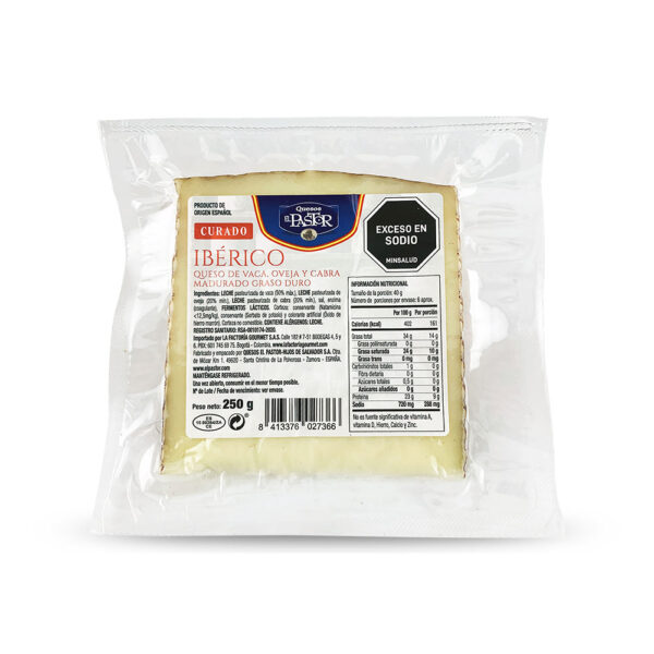 Queso Ibérico Curado: Una mezcla exquisita de leche de vaca, oveja y cabra, madurado durante el tiempo adecuado para ofrecer un sabor intenso y una textura perfecta. Presentado en cuña de 150g, es el deleite perfecto para los amantes del queso.