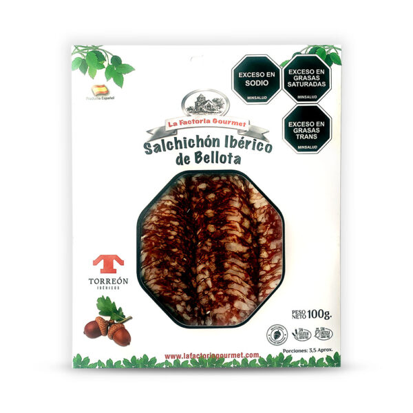 Salchichón Ibérico de Bellota: Embutido premium español, elaborado con cerdos ibéricos alimentados con bellotas. 100g de sabor intenso y textura suave. Ideal para tablas de embutidos, bocadillos gourmet o como parte de una selección de tapas. Un deleite para los amantes de la gastronomía española.