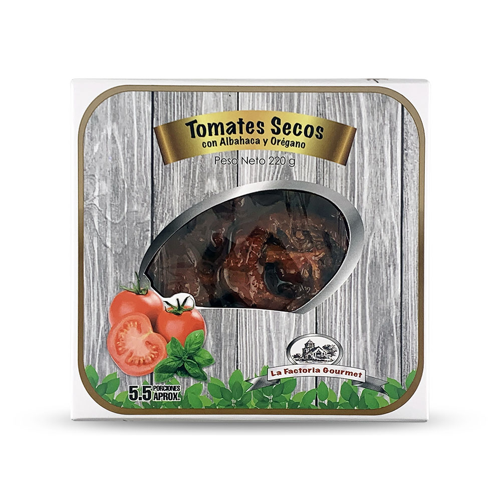 Tomates secos con albahaca y orégano: una deliciosa combinación aromática para ensaladas y platos gourmet. Envase de 220g, sabor mediterráneo en cada bocado.