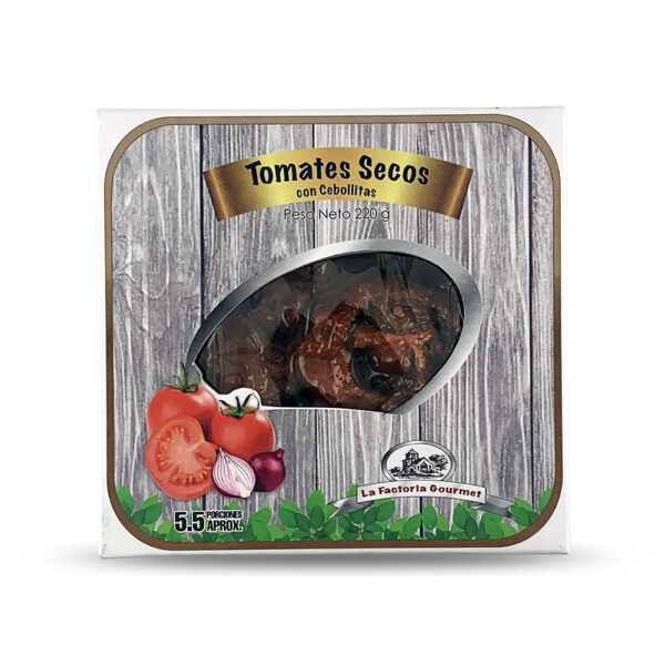 Tomates secos con cebollitas Ocañeras: Una combinación deliciosa para ensaladas y platos gourmet, en un envase de 220g lleno de sabor mediterráneo.