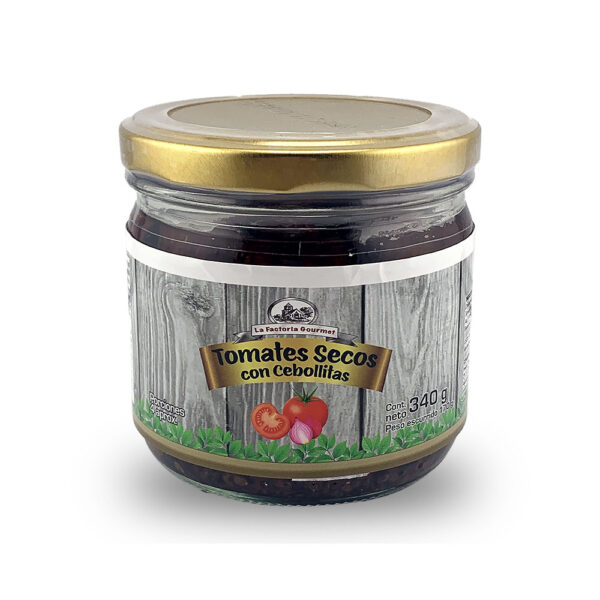 Tomates secos con cebollitas Ocañeras: Una combinación deliciosa para ensaladas y platos gourmet, en un envase de 340g lleno de sabor mediterráneo.